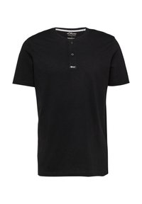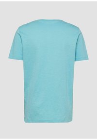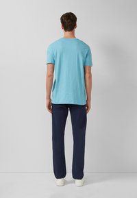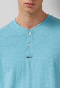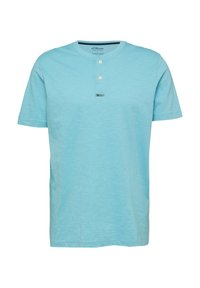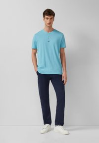 Jeune homme aux cheveux bruns courts portant un t-shirt henley à manches courtes bleu clair et un pantalon bleu foncé sur un fond uni.