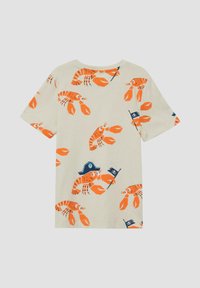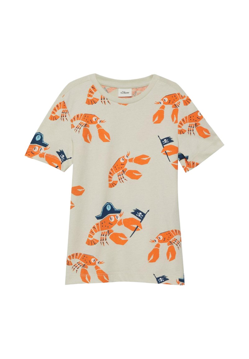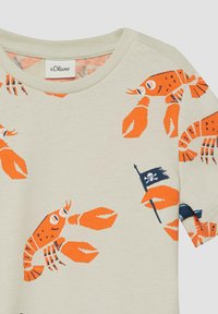 Chemise beige à manches courtes avec un motif de homards orange portant des chapeaux de pirate bleu marine et tenant des drapeaux de pirate bleu marine sur tout le tissu.