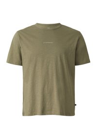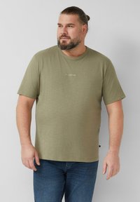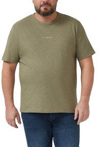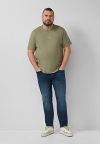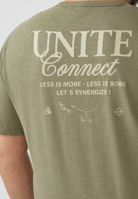 Homme aux cheveux bruns attachés en chignon, portant un T-shirt vert olive avec le texte « UNITE Connect », un jean bleu et des baskets blanches, debout face à un mur gris.