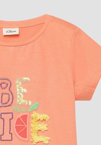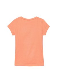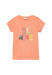 T-shirt corail à manches courtes pour tout-petit avec texte multicolore "BE NICE", incluant une application feuille et fruit au centre devant.
