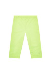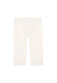 Collants blancs à taille élastique, longueur jusqu'aux genoux, avec un petit logo embossé près de l'ourlet inférieur sur la jambe gauche.