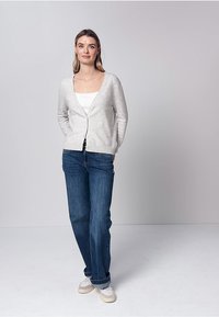 Cardigan gris clair en tissu tricoté doux, avec col en V, fermeture à boutons et poignets en côtes, porté avec un jean bleu.