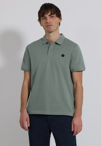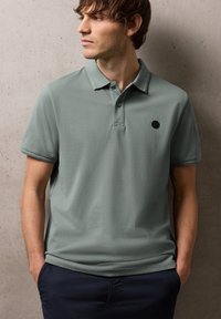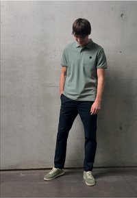 Jeune homme aux cheveux courts et bruns, portant un polo vert pâle et un pantalon foncé, debout devant un fond uni gris clair.