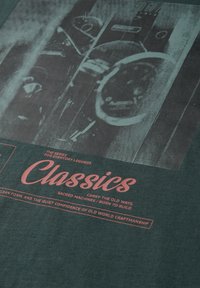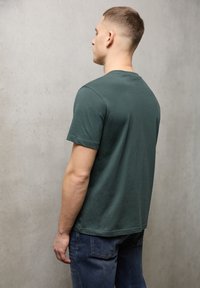 Homme portant un t-shirt graphique vert foncé et un jean foncé, debout avec une main dans la poche, regardant sur le côté contre un mur gris uni.