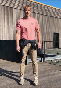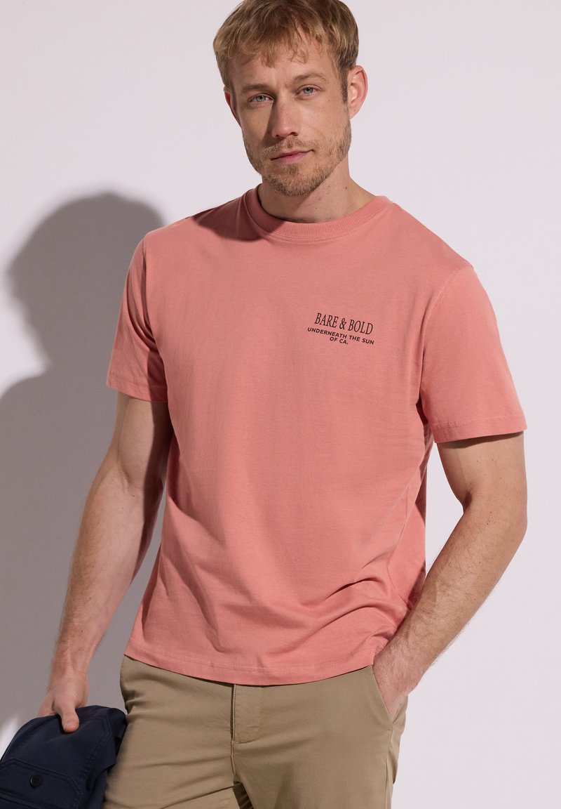 Homme portant un T-shirt rose saumon avec le texte « Bare & Bold », pantalon kaki, tenant une veste bleu marine, debout contre un mur clair.