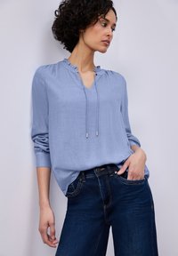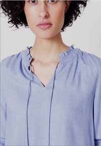 Femme aux cheveux bouclés portant un chemisier bleu clair à manches longues avec un col à volants et un jean bleu foncé, debout contre un mur clair.
