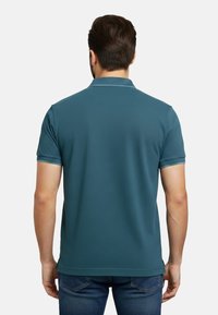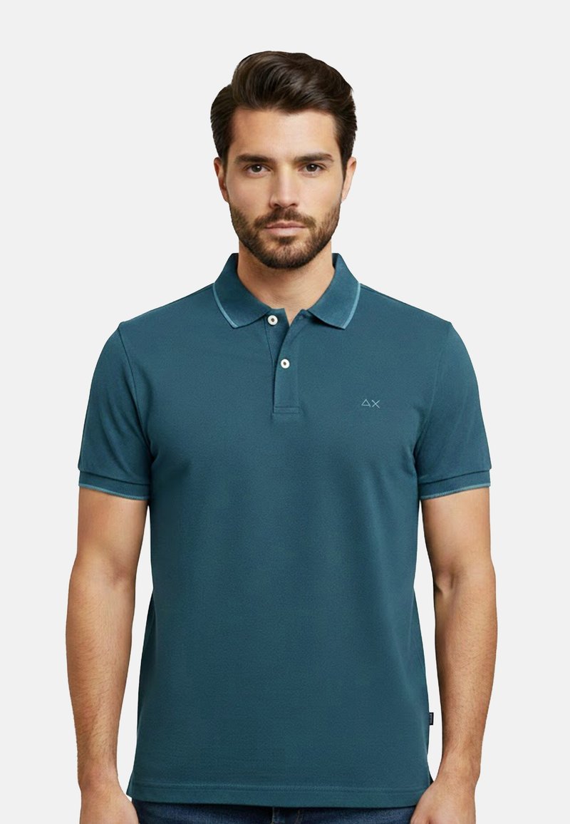 Homme aux cheveux foncés et à la barbe, portant un polo bleu sarcelle à manches courtes avec deux boutons et un logo subtil sur la poitrine.