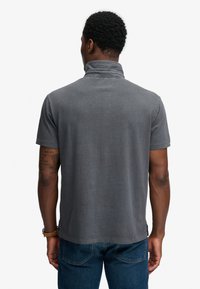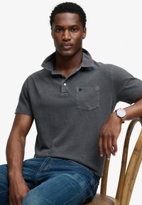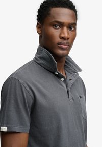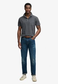 Homme aux cheveux courts et bouclés portant un polo à manches courtes gris foncé, un jean bleu, une ceinture tressée marron et une montre-bracelet, debout avec une main dans la poche.