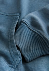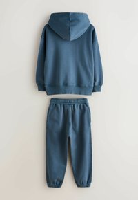 Ensemble sweat à capuche en polaire bleu avec pantalon de survêtement assorti, doté d'une poche avant et de poignets élastiques, idéal pour une tenue décontractée.