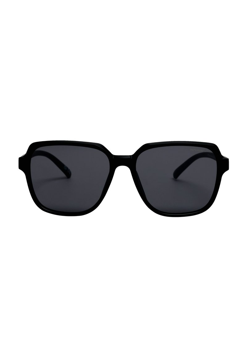 Lunettes de soleil rectangulaires noires avec des montures épaisses et des verres teintés foncés, vues de face sur fond blanc.