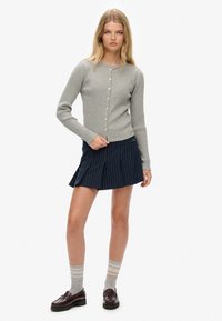 Cardigan gris à côtes avec des manches longues et un col rond, présentant une fermeture à boutons sur le devant. Porté avec une jupe rayée bleu marine.
