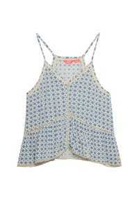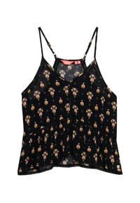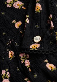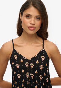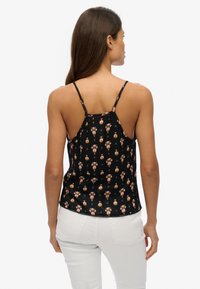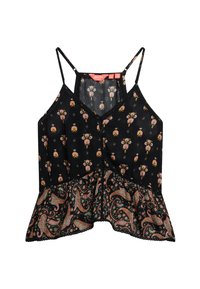 Femme portant un haut noir sans manches à motifs floraux avec des boutons et un pantalon blanc, debout avec une main dans la poche devant un fond uni.