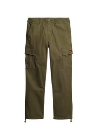 Pantalons cargo gris foncé en coton avec plusieurs poches latérales, une coupe ample et un design à jambe droite. Comprend une ceinture noire et des coutures visibles.