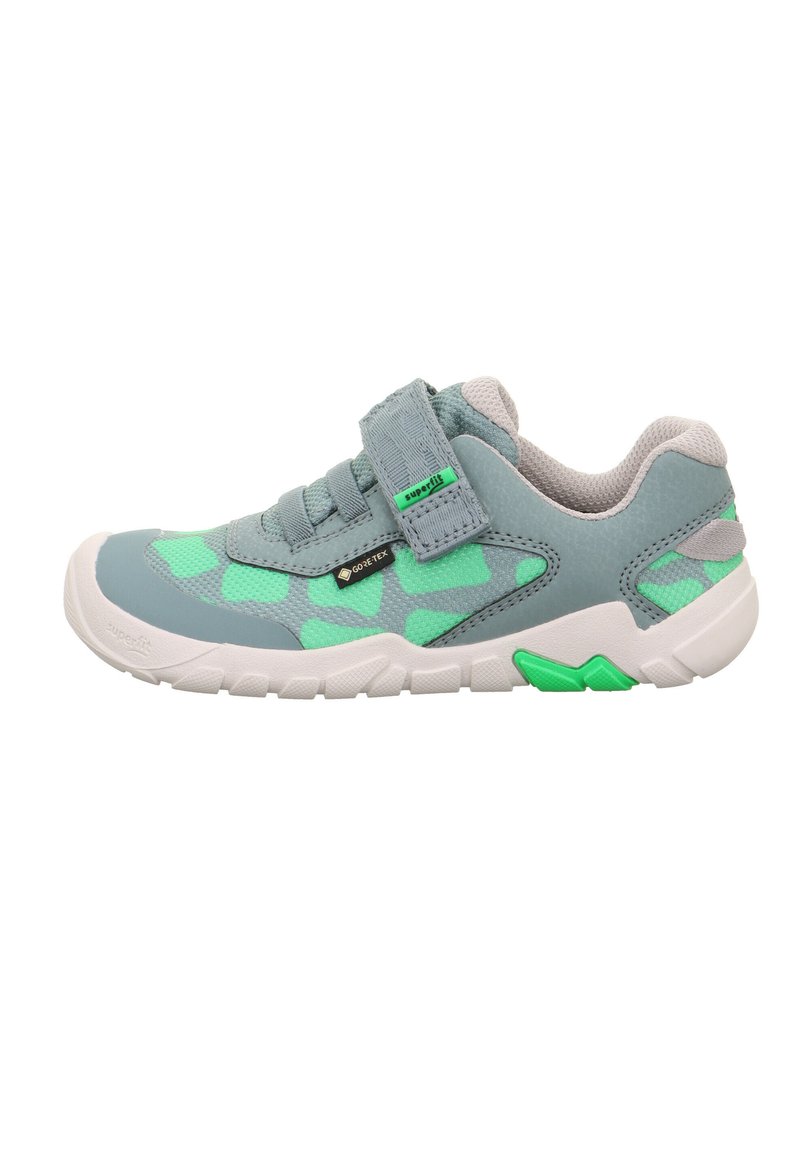 Baskets basses pour enfants en gris et vert avec bride auto-agrippante, maille respirante, étiquette Gore-Tex et semelle blanche avec accents verts.