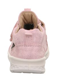Baskets pour tout-petit roses avec deux bandes Velcro, semelle blanche texturée, dessus respirant et étiquette imperméable Gore-Tex sur le côté.