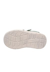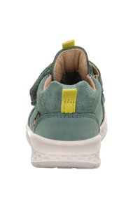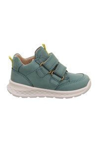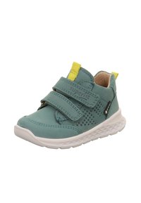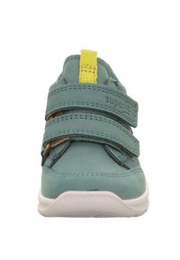 Baskets pour enfants de couleur sarcelle avec deux bandes Velcro, accents jaunes, côté perforé, semelle blanche rembourrée et étiquette Gore-Tex sur le talon.