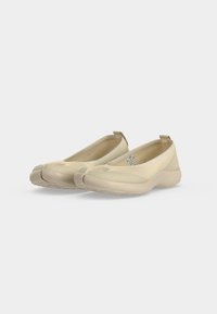 Chaussure beige à enfiler avec bout rond, semelle légère, dessus en tissu et languette au talon, présentée sur fond blanc uni.