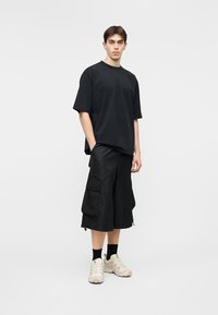 Jeune homme aux cheveux bruns courts portant un T-shirt noir surdimensionné et un short cargo noir, debout devant un fond clair uni.