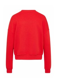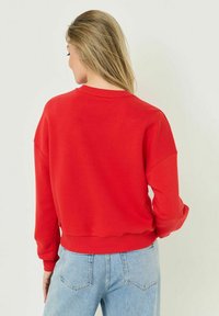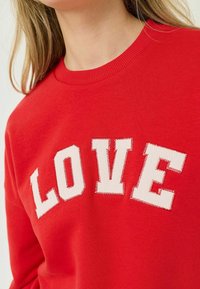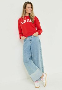 Femme souriante aux cheveux longs et blonds portant un sweat-shirt rouge avec le texte « LOVE » et un jean taille haute bleu clair, posant avec la main dans les cheveux.