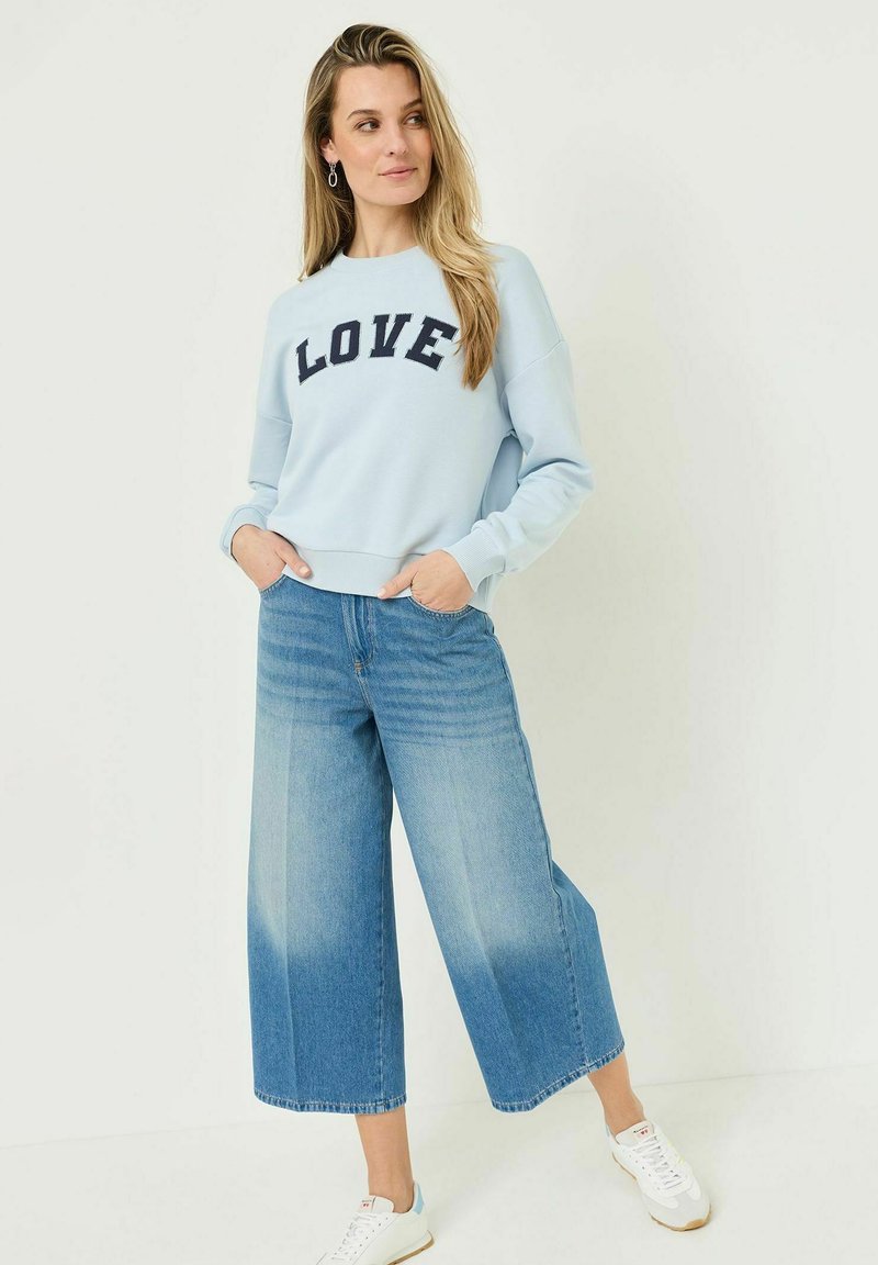Femme aux longs cheveux blonds portant un sweat-shirt bleu clair avec l'inscription "LOVE", un jean large et court bleu, et des baskets blanches, debout contre un mur blanc.