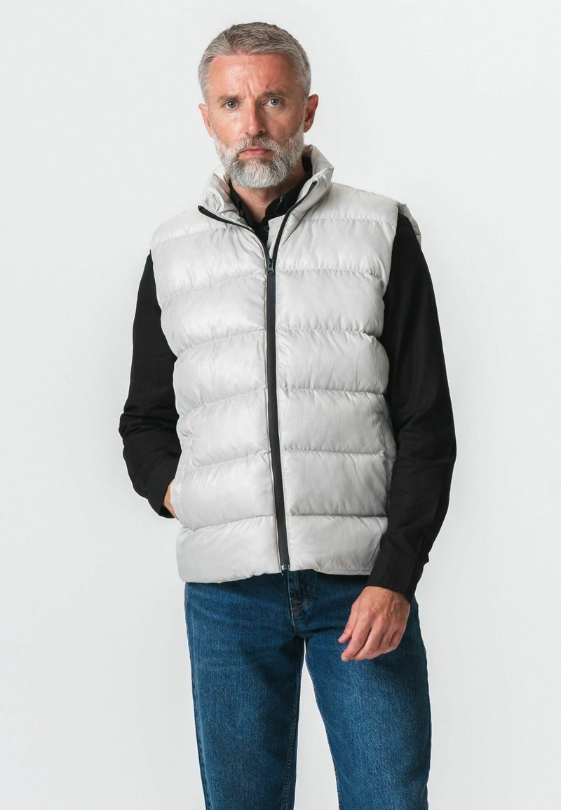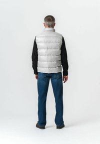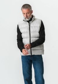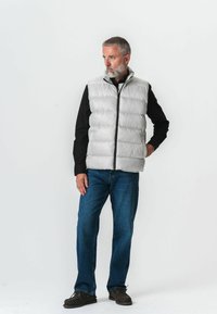Homme à la barbe grise portant une veste matelassée blanche sur un chemise noire à manches longues et un jean bleu, debout avec une main dans la poche.