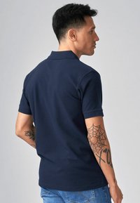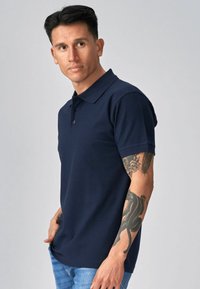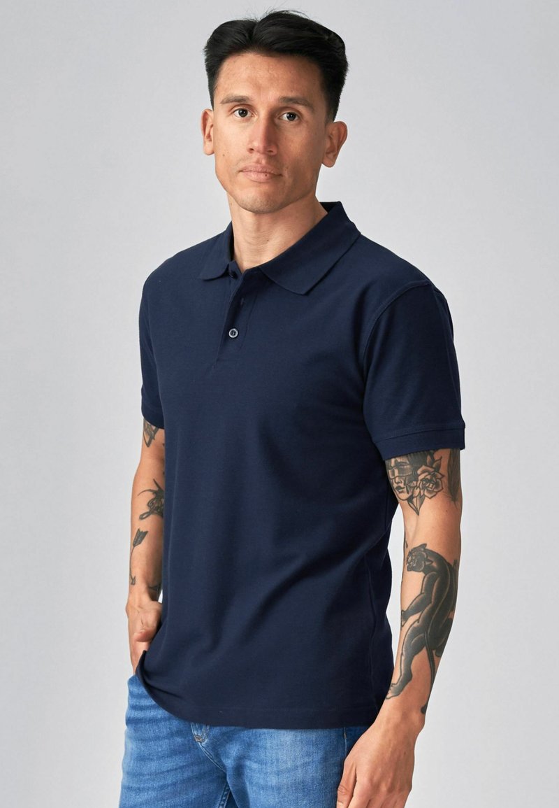 Homme aux cheveux courts et foncés, portant un polo bleu marine et un jean bleu clair, montrant des tatouages sur les deux avant-bras, debout devant un fond gris.