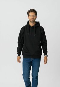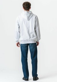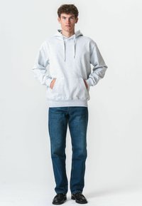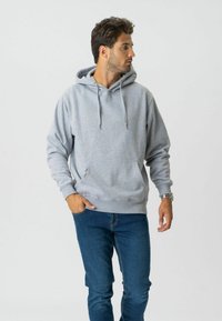Jeune homme aux cheveux bouclés portant un sweat à capuche gris clair et un jean bleu, debout devant un fond blanc.