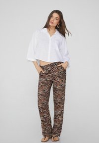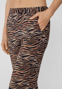 Pantalons amples en tissu doux, avec un motif rayé de tigre dans des tons de marron, noir et beige, dotés d'une taille élastique.