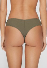 Femme portant un sous-vêtement bikini côtelé vert olive avec des bords festonnés, debout devant un fond clair uni.