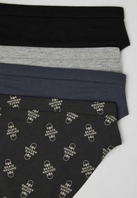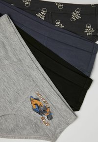 Quatre slips pour garçons en noir avec motif skate, unis marine, unis noir, et gris avec un motif voiture de course sur le devant à gauche.