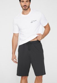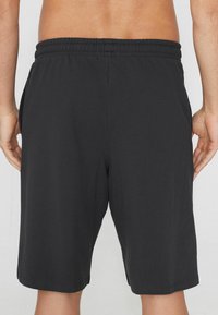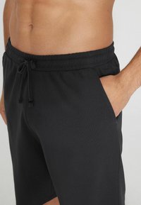 Shorts noirs arrivant aux genoux avec une taille élastique et un cordon de serrage, portés par une personne debout avec les mains détendues le long du corps.