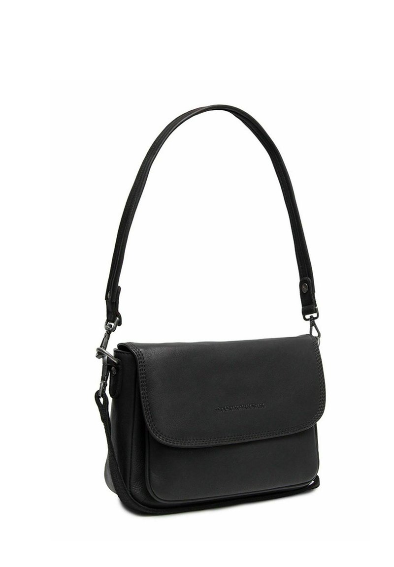 Sac à épaule en cuir noir avec rabat sur le devant et bandoulière réglable, avec un marquage discret en relief sur le rabat.