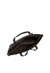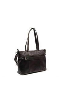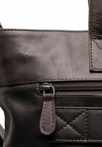 Sac cabas en cuir marron foncé avec poignées supérieures doubles, poche avant zippée et bandoulière amovible sur fond blanc.