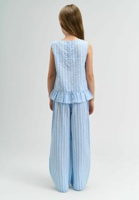 Haut peplum rayé bleu clair avec un ourlet volanté, associé à un pantalon rayé bleu clair ample. Le matériau semble respirant et doux.