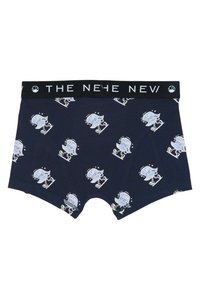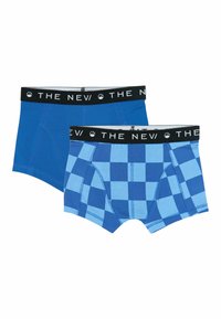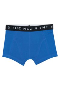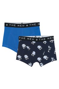 Deux paires de boxers pour garçons, l'une bleu uni et l'autre bleu marine avec un motif de skieur en dessin animé blanc, toutes deux avec des ceintures élastiques noires portant l'inscription "THE NEW".