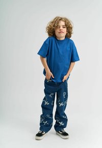 T-shirt en coton bleu avec une coupe décontractée, associé à un jeans en denim ample avec des imprimés graphiques blancs. Des baskets noires complètent la tenue.