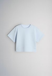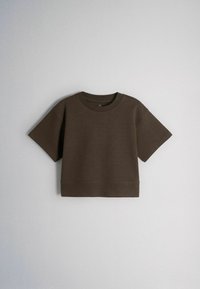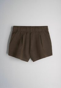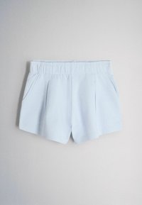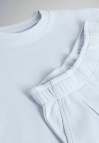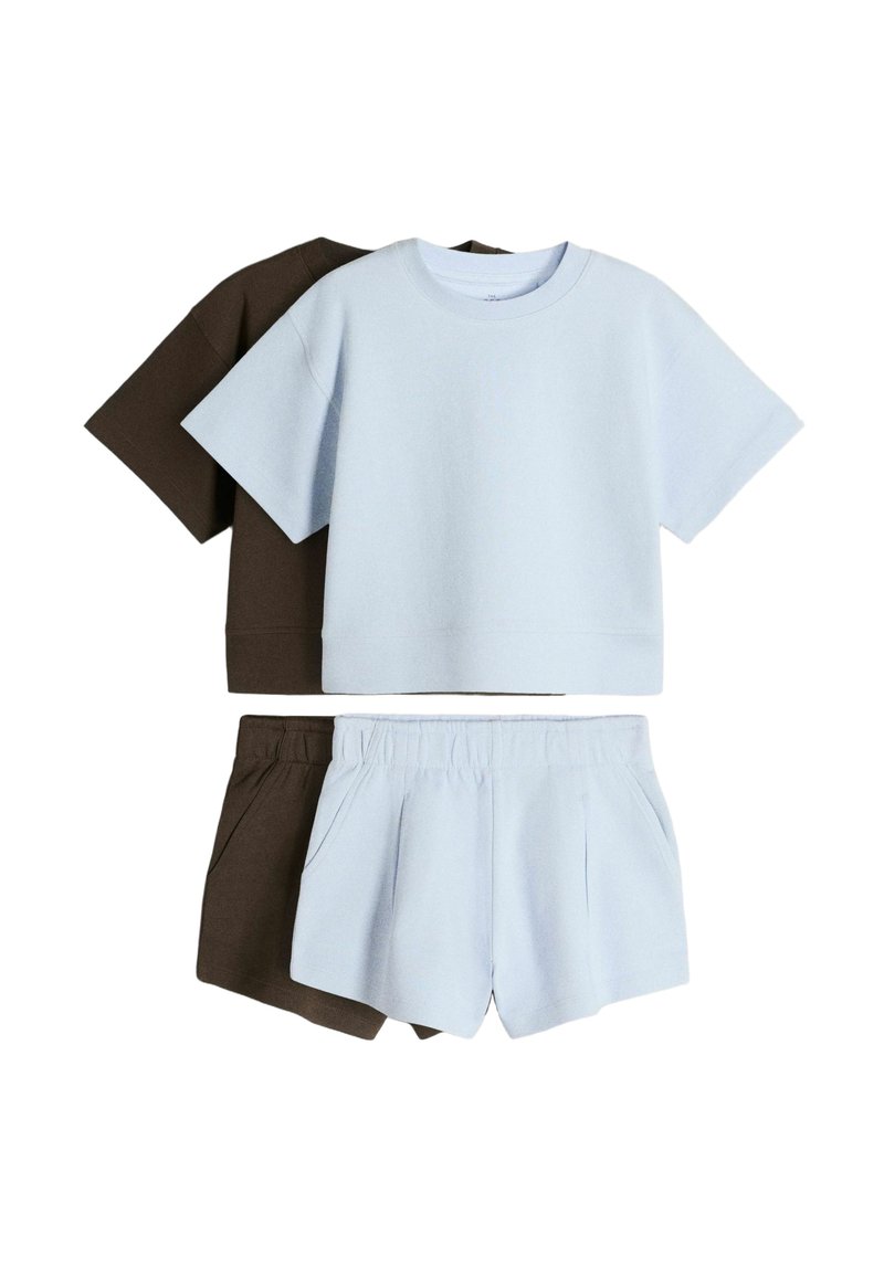 Deux ensembles de vêtements décontractés pour se détendre, composés de hauts à manches courtes et de shorts à taille élastique, l'un en bleu clair et l'autre en marron foncé.