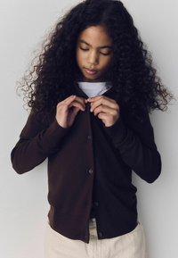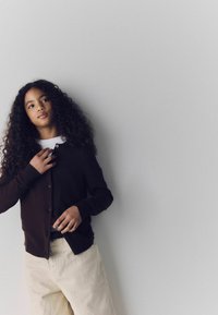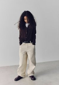 Jeune personne aux cheveux bouclés portant un cardigan marron foncé, un pantalon ample crème, une ceinture noire et des chaussures foncées, debout les mains dans les poches.