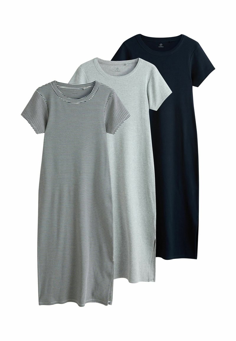 Trois robes midi à manches courtes, l'une à rayures noires et blanches, une autre gris clair uni, et une dernière noire unie, présentées en chevauchement sur un fond blanc.