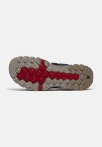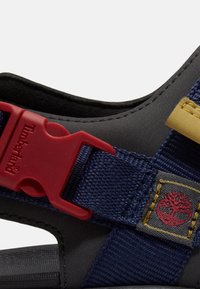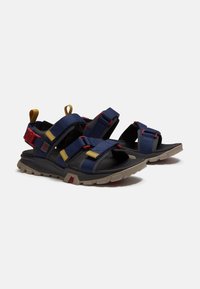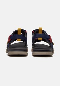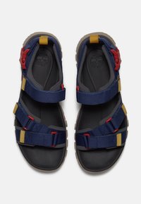 Sandale d'extérieur pour hommes avec des sangles bleu marine, une semelle noire, des accents tannés et une boucle rouge, conçue pour les terrains accidentés et un ajustement réglable.