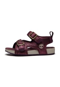 Sandale métallique bronze pour enfants avec deux brides réglables à boucle, bout ouvert, semelle rembourrée et logo de l'arbre Timberland sur le côté.