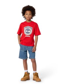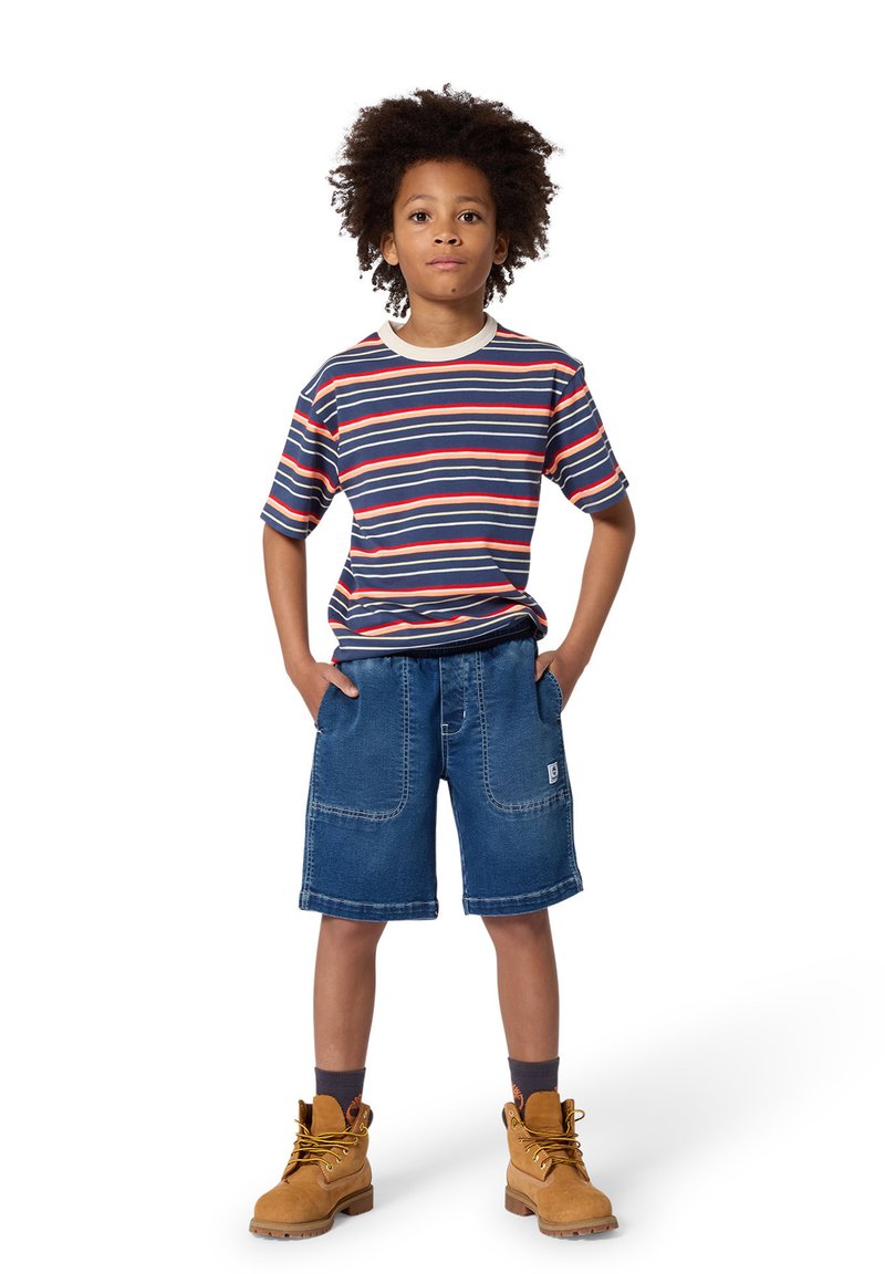 Garçon debout les mains dans les poches, portant un t-shirt rayé, un short en jean, des chaussettes foncées et des bottes à lacets couleur cuir clair, sur un fond blanc.
