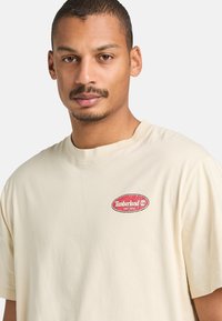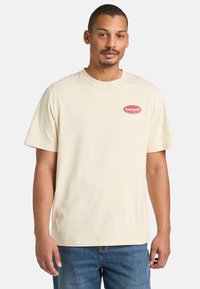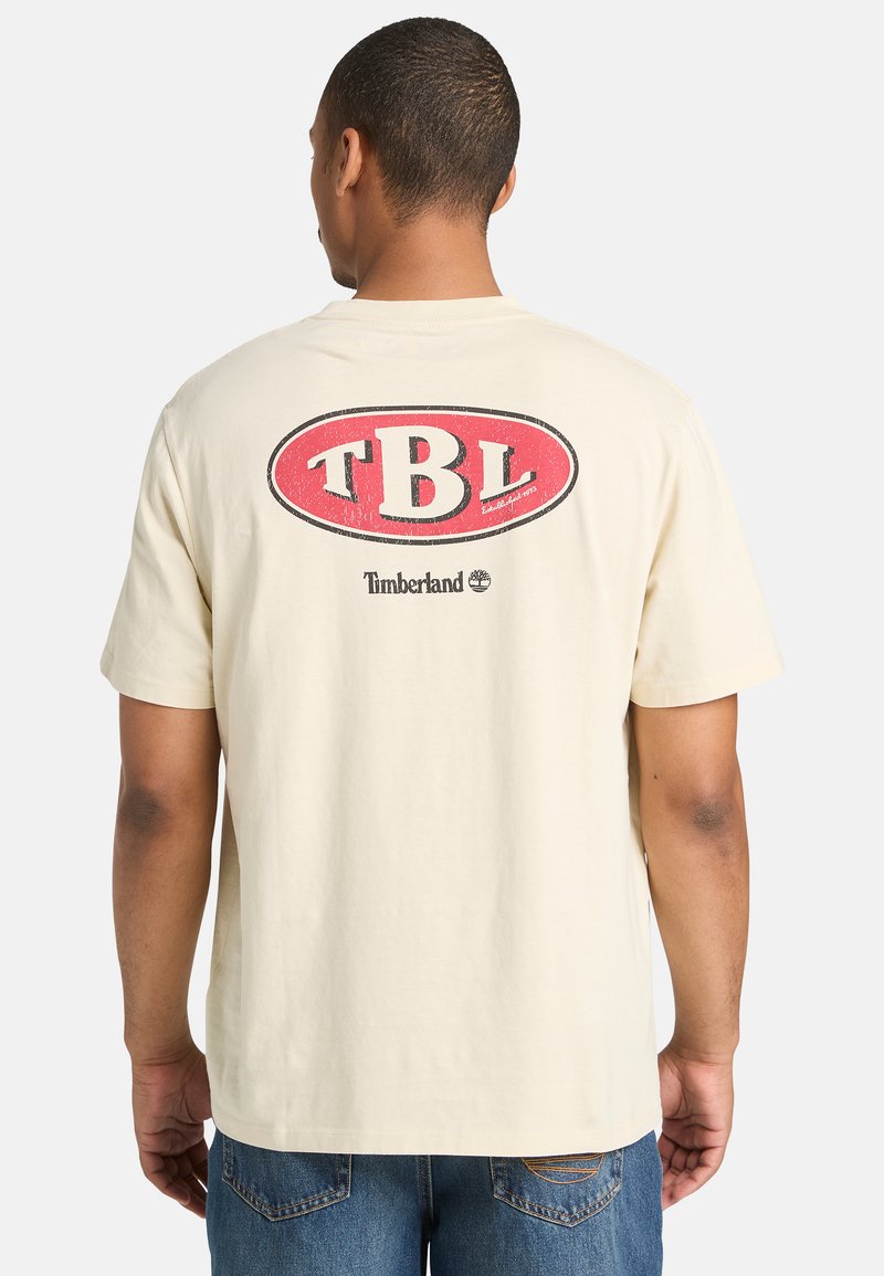 T-shirt en coton beige clair avec un grand graphique ovale rouge arborant "TBL" en texte blanc gras et "Timberland" en dessous. Coupe décontractée, manches courtes.