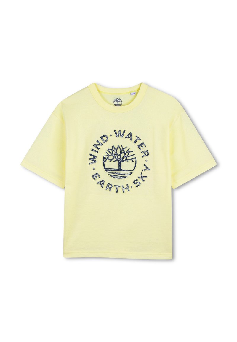 T-shirt en coton jaune avec un col rond et des manches courtes, présentant un motif imprimé incluant "VENT, EAU, TERRE, CIEL" en bleu.