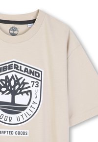 T-shirt beige à manches courtes en coton, arborant un grand logo Timberland imprimé en noir avec un design d’arbre et l’inscription "Crafted Goods".