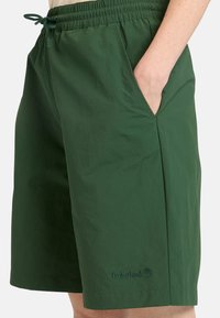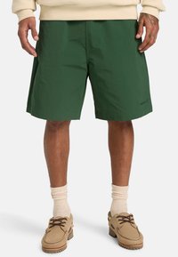 Homme portant un short vert foncé jusqu'aux genoux, des chaussettes crème, des chaussures beige à lacets et un haut à manches longues crème, avec des mains tatouées visibles.
