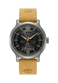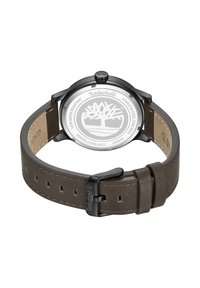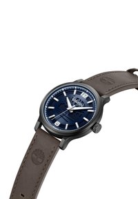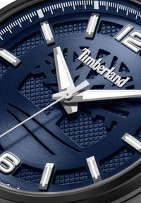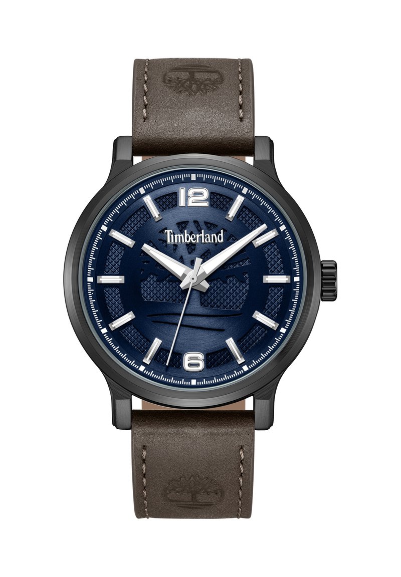Montre Timberland avec cadran texturé bleu, index argentés, aiguilles blanches, boîtier noir et bracelet en cuir marron embossé du logo arbre.