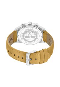 Montre Timberland bicolore argent avec cadran blanc, tachymètre, deux sous-cadrans, guichet de date et bracelet en cuir tan embossé du logo arbre.
