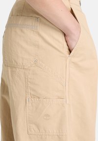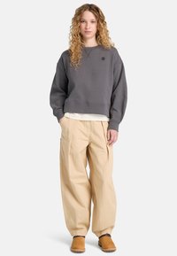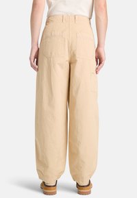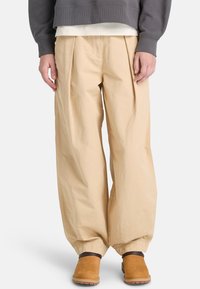 Pantalon beige à jambes larges avec des plis et des poignets élastiqués, confectionné dans un tissu léger. Associé à un pull gris foncé et des chaussures marron.