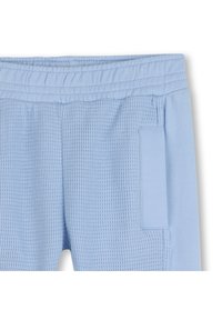 Shorts bleu clair en tricot gaufré texturé, dotés d'une taille élastique et de deux poches latérales. Les bords sont froncés pour un ajustement près du corps.